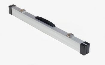 Внутри кейса расположено два отделения, покрытых мягкой тканью — для турняка кия и шафта. Корпус из алюминия серебристого цвета защищает кий от любых дорожных неприятностей, он легко чистится, устойчив к ударам и царапинам. Для транспортировки имеется удобная выдвижная рукоятка черного цвета. Закрывается кейс на 2 металлических замка.